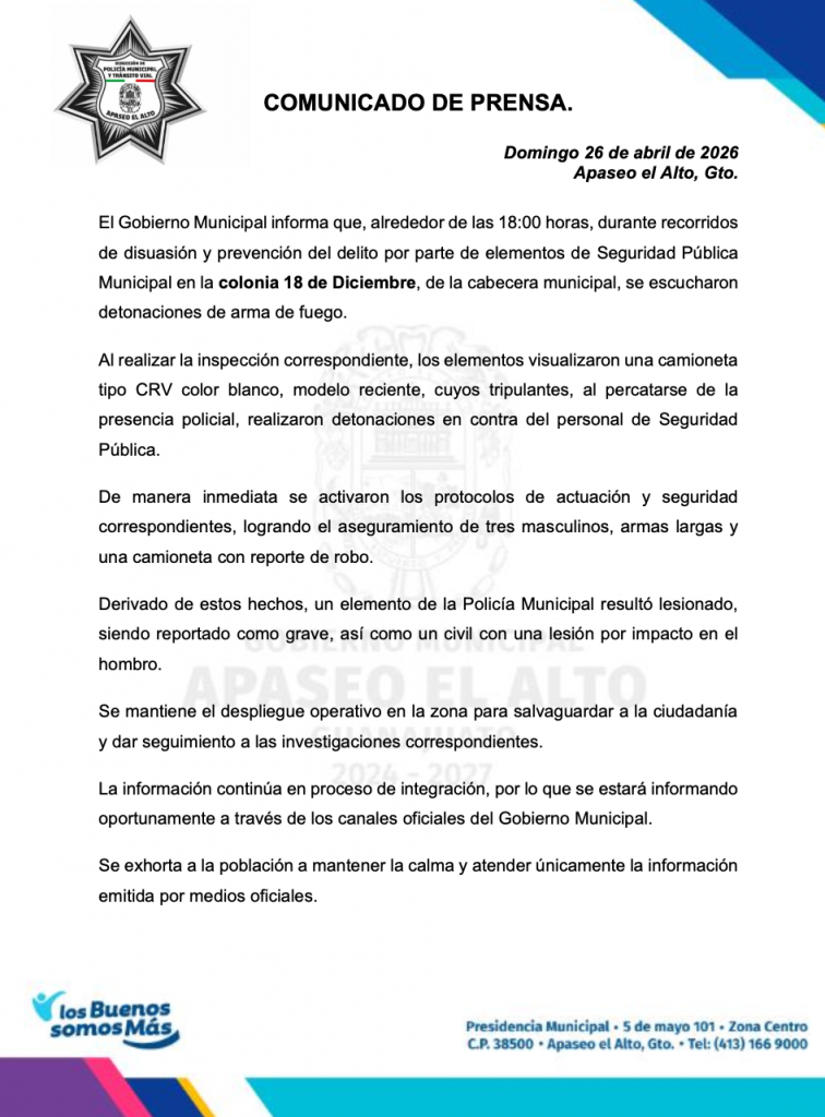 Se reportan al menos tres presuntos delincuentes detenidos, junto con tres armas largas decomisadas, el vehículo en el que viajaban, así como un elemento municipal herido, al cuál trasladaron grave al hospital.