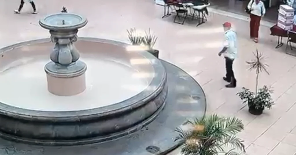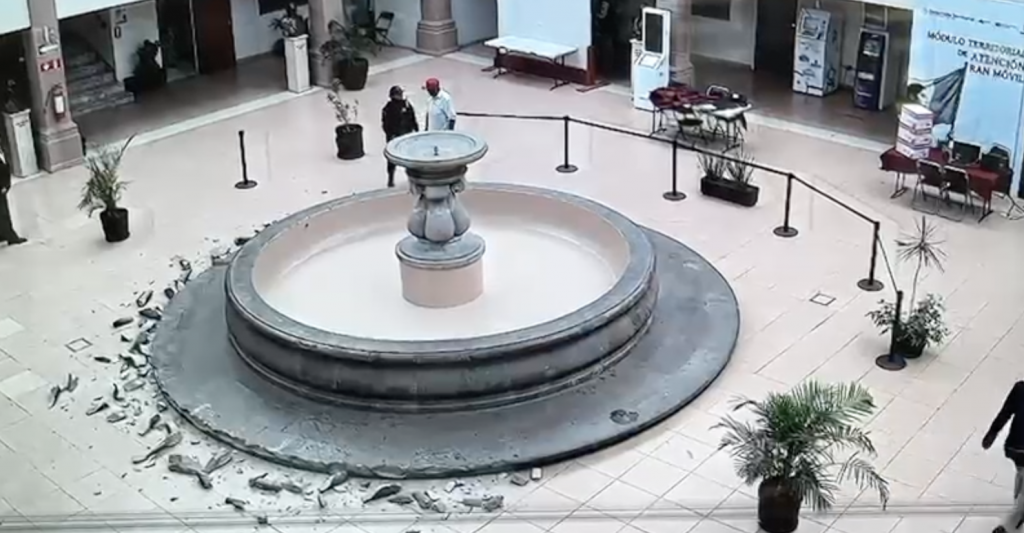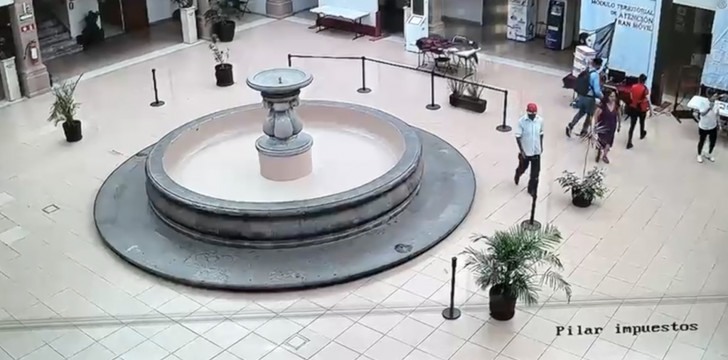 Un sujeto destrozó la base de la fuente ubicada al interior de la presidencia municipal de Celaya. El reloj marca las ocho de la mañana en punto, el hombre, que vestía una camisa blanca, pantalón negro y una gorra en color rojo, ingresa al patio central y se dirige directamente a la fuente.