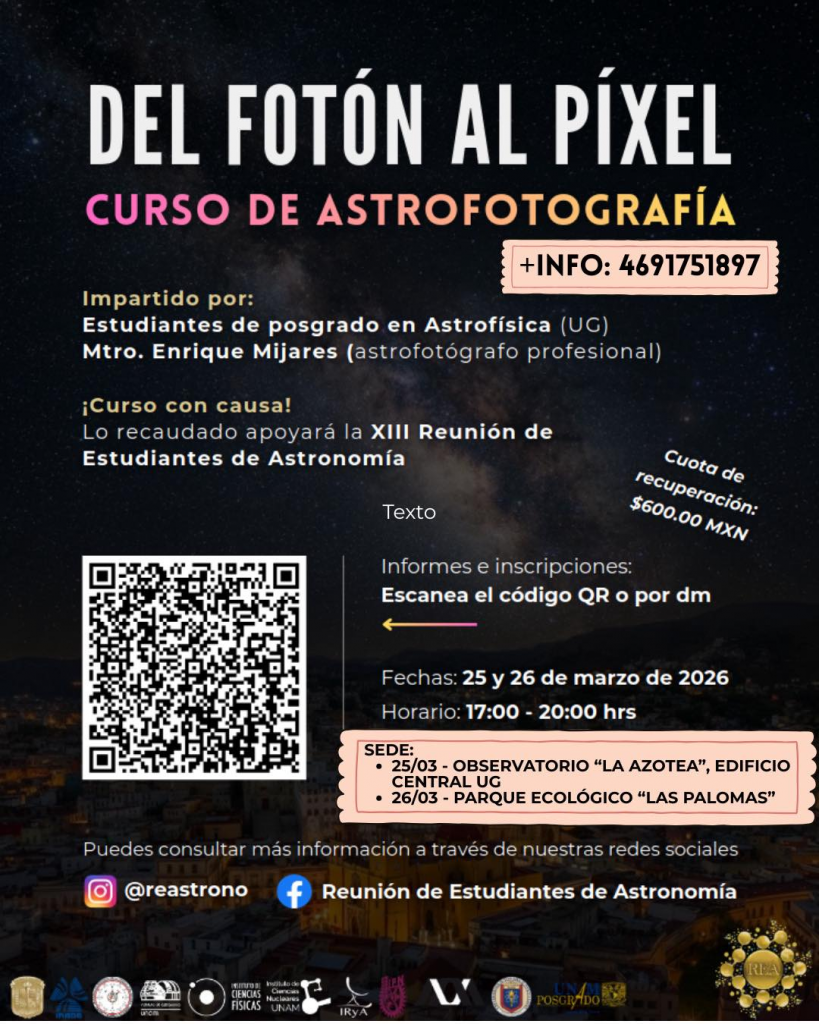 Estudiantes del posgrado en Astrofísica de la Universidad de Guanajuato (UG) realizarán el curso “Del fotón al píxel”, una propuesta académica y de divulgación científica enfocada en la astrofotografía, con el objetivo de recaudar fondos para la Reunión de Estudiantes de Astronomía (REA) 2026.