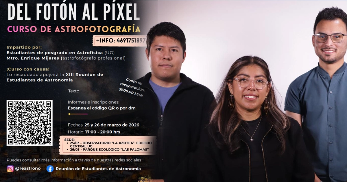 Estudiantes del posgrado en Astrofísica de la Universidad de Guanajuato (UG) realizarán el curso “Del fotón al píxel”, una propuesta académica y de divulgación científica enfocada en la astrofotografía, con el objetivo de recaudar fondos para la Reunión de Estudiantes de Astronomía (REA) 2026.