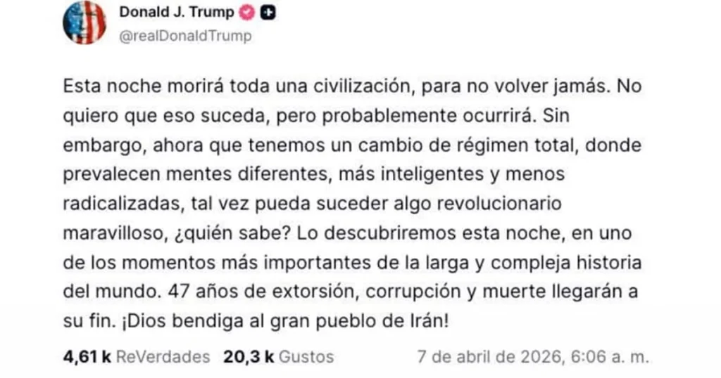 El presidente de Estados Unidos, Donald Trump, elevó la tensión internacional al lanzar un ultimátum a Irán con una advertencia muy fuerte, “Toda una civilización morirá” si no se cumplen sus exigencias antes de una hora límite este martes.